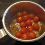 Voeg de tomaatjes, kippenbouillon, zout, chilivlokken en suiker toe. Laat gedurende een minuut of 15 stoven of totdat de tomaatjes open barsten en zijn sap loslaat en al het vocht bijna verdampt is.