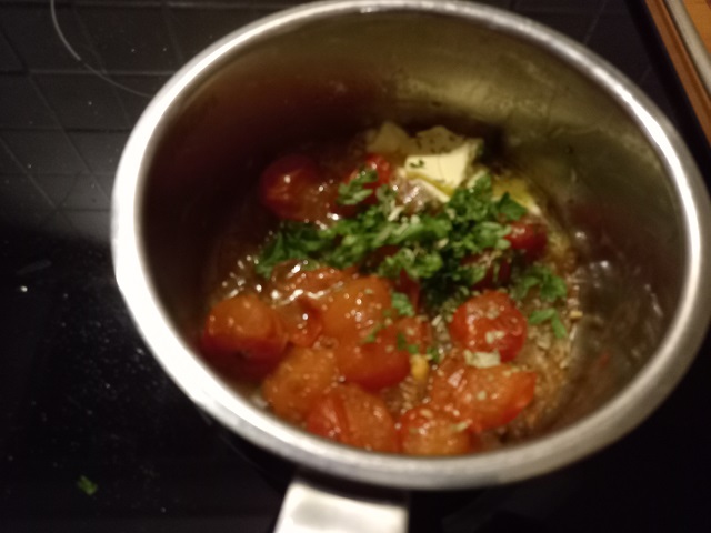 Zet het vuur uit en voeg de boter en de kruiden toe.