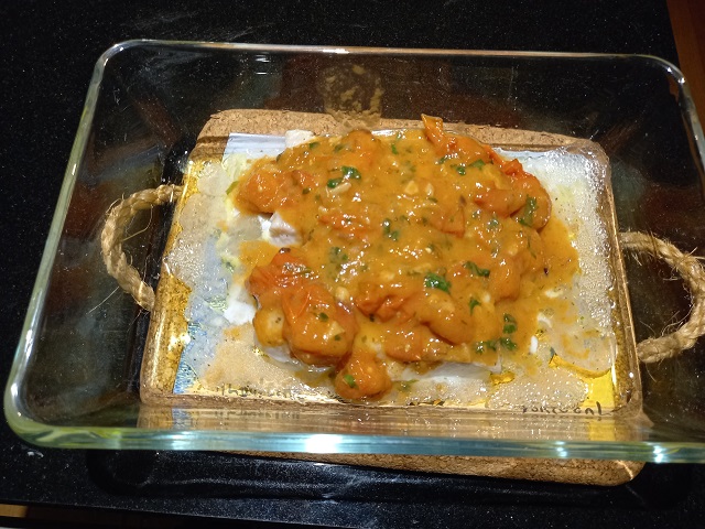 Verdeel de saus over de kabeljauw. Leg de aluminiumfolie weer op de schaal en laat 2 minuten staan zodat de smaken goed kunnen intrekken.