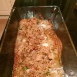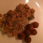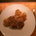Verdeel over de borden. Wij aten er aardappelbolletjes bij uit de oven.