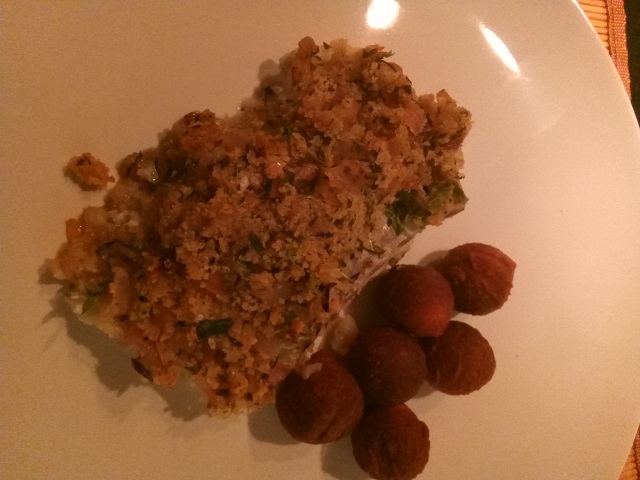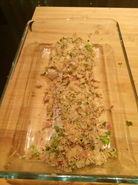 Meng in een kom de paneermeel, de reductie, peterselie, de olie,het sap van de citroen en wat zout en peper. Meng het geheel goed door elkaar.