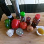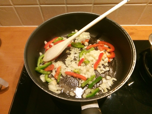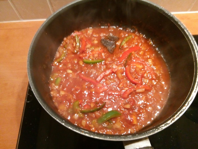 2. Pel en snipper de ui. Pel de knoflook en hak fijn. Snijd de tomaat in blokjes. Maak de paprika schoon en snijd in smalle reepjes. Verhit de helft van de olijfolie in een hapjespan en fruit de ui. Voeg de paprikareepjes en tomatenpuree toe. Voeg de sambal, gehakte tijm en wat komijn toe. Voeg de visbouillon toe en laat, op laag vuur, inkoken.