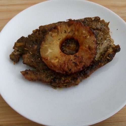 Leg de karbonades in een ovenschaal. Leg de ananasschijven op de karbonades. Giet het bakvocht van de ananas over de karbonades met het citroensap. Zet de schaal in de oven en laat nog 12 tot 15 minuten garen, afhankelijk van de dikte van de karbonades.