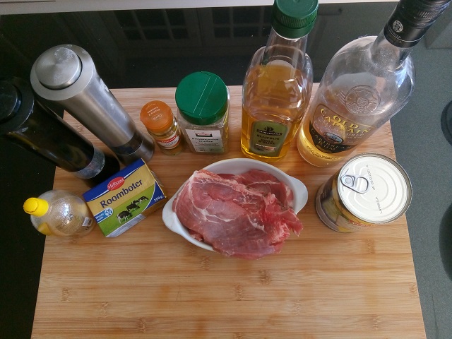 Verwarm de oven voor op 180°. Verhit in een koekenpan een scheutje olie en bak de karbonades aan beide zijden aan. Bestrooi met wat zout en peper.