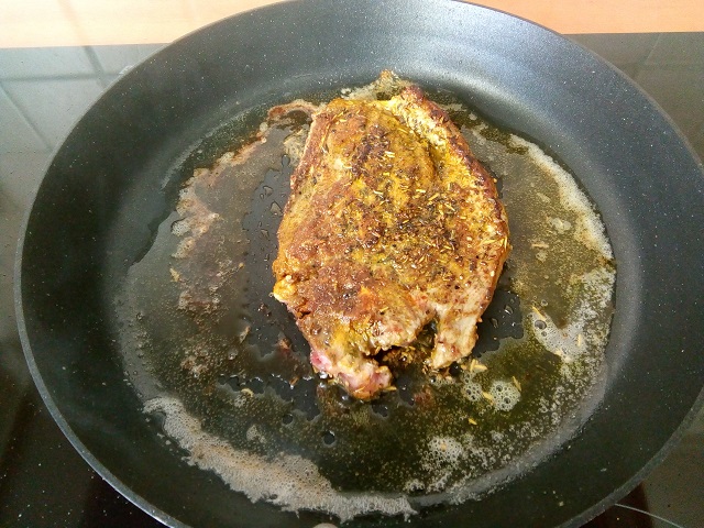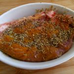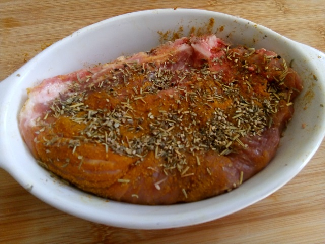 Strooi de provençaalse en de colombokruiden aan beide zijden over de karbonades. Giet een eetlepel olie over de karbonades en laat 2 uur marineren in de koelkast.