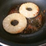 Verhit in een andere koekenpan een eetlepel olie en de boter en bak de ananasschijven aan beide zijden. Bestrooi met een klein beetje colombokruiden, de rum en 2 el ananassap.