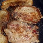 Verhit de olie in een koekenpan en bak de karbonades en de plakjes spek aan beide kanten. Voeg wat zout en peper toe.