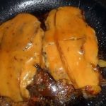 Zet het vuur lager. Besmeer één zijde van de karbonades met mosterd. Leg op elke karbonade een plakje spek en dek af met de plakjes Cheddar. Voeg een klontje boter toe.