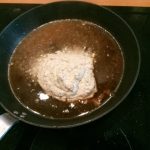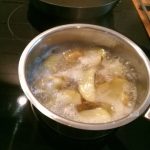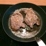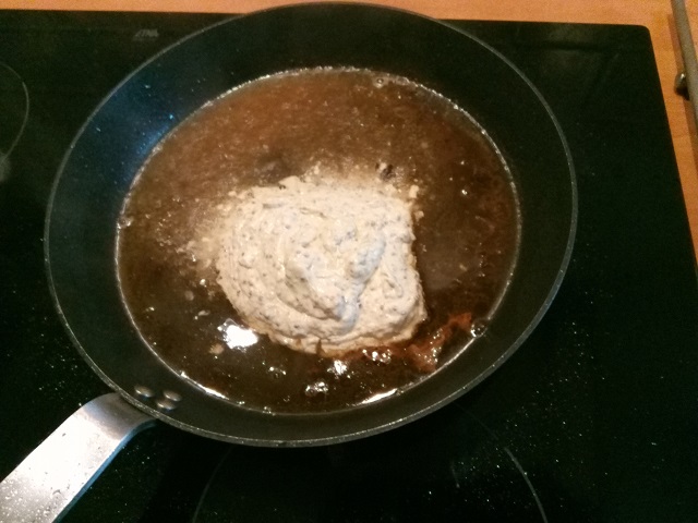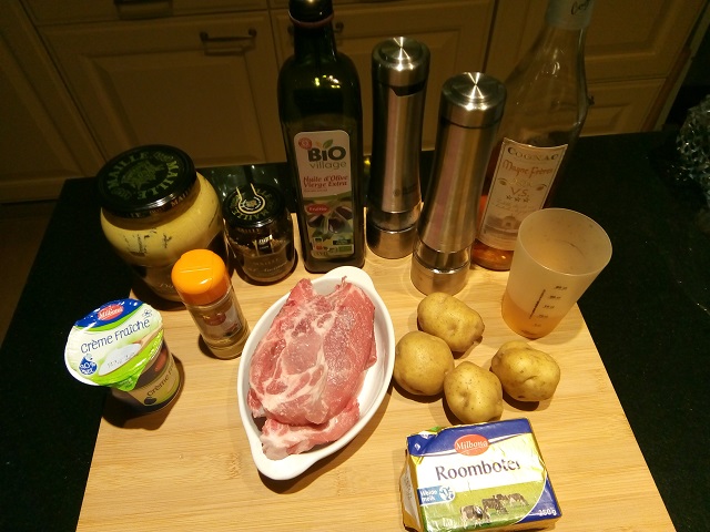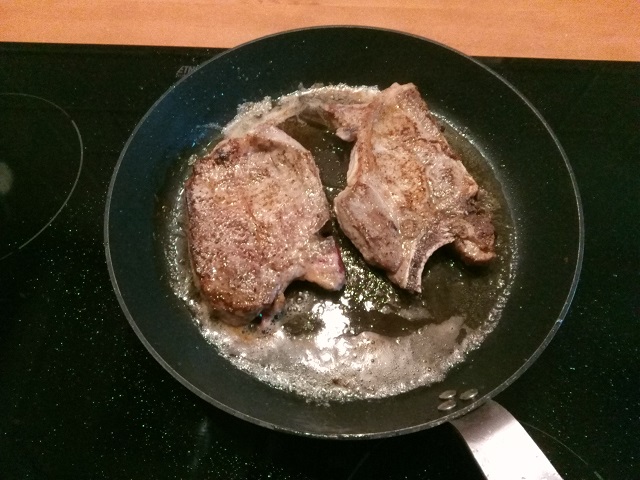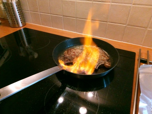 Zet de afzuigkap uit! Giet een scheutje cognac in de pan en flambeer. Zodra het vuur gedoofd is kan de afzuigkap weer aan. Laat de karbonades nog even garen en haal ze dan uit de pan. Bewaar in aluminiumfolie.