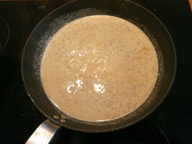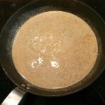 Giet nog 5 cl cognac in de pan samen met de kalfsfond. Zet het vuur lager en laat even zachtjes koken zodat de alcohol verdampt. Giet het mosterd mengsel in de pan.