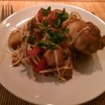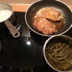 5. Verdeel over de borden, verdeel de saus erover  en garneer met wat blaadjes peterselie.