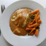 4. Verdeel de karbonaden over de borden en giet er wat saus over. Doe de rest van de saus in een sauskom.