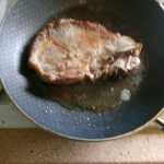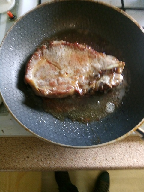 2. Verhit in een koekenpan de olie en de rest van de boter. Strooi zout en peper over de karbonades en bak deze aan beide zijden mooi bruin. Haal de karbonades uit de pan en houd deze warm in aluminiumfolie.