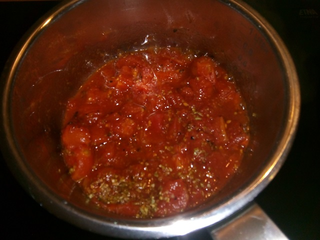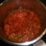 Laat in een steelpan de tomatenblokjes met de oregano, zout, peper en het paprikapoeder inkoken.