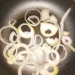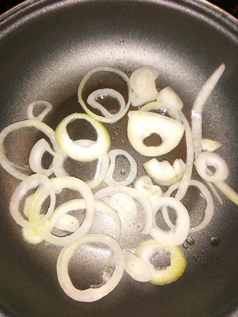 Maak de ui schoon en snijd in ringen. Verhit een el. olie in een koekenpan en fruit de uiringen aan.