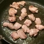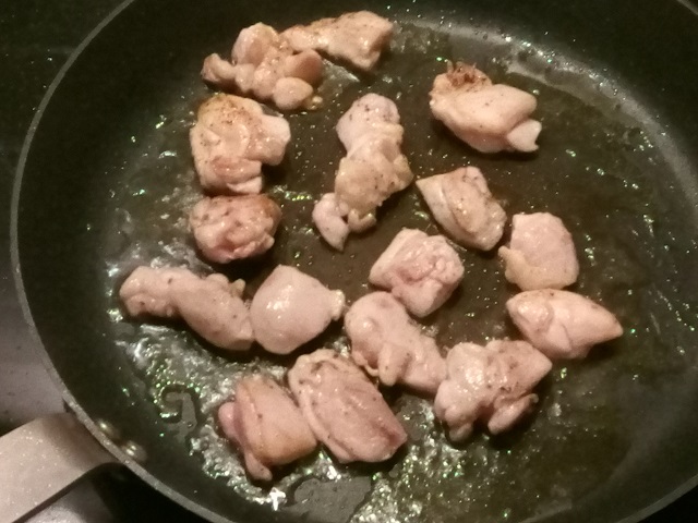 2. Bestrooi de kipblokjes met zout en peper. Verhit de olie in een koekenpan of hapjespan. Bak de kipblokjes rondom aan. Haal de ki uit de pan en bewaar onder aluminiumfolie.