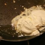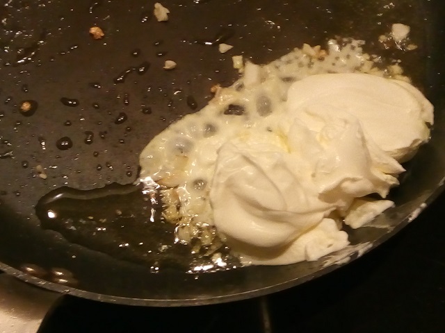 3. Fruit in dezelfde pan de knoflook. Voeg na een halve minuut de crème fraîche toe. Verwarm zodanig dat de crème fraîche vloeibaar wordt.