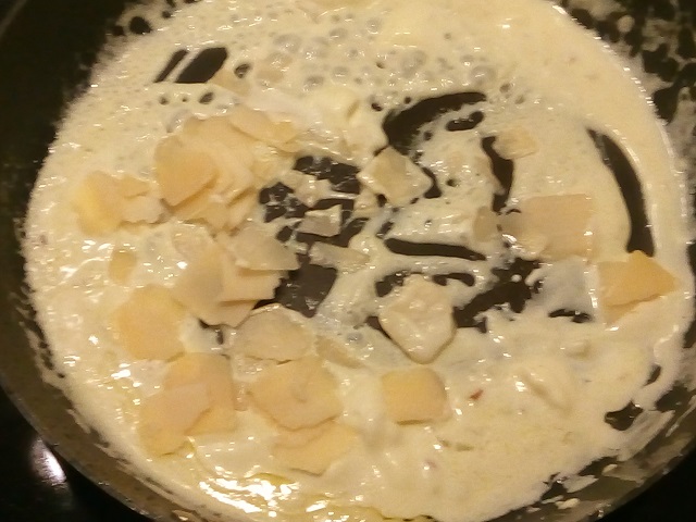 4. Voeg de Parmezaanse kaas toe en laat deze in de saus smelten.