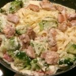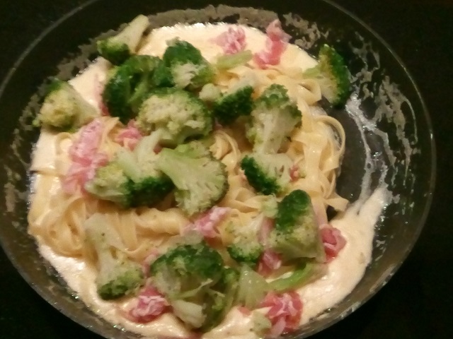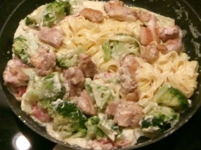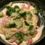 6. Voeg de afgegoten pasta en broccoli toe aan de saus en schep het gerecht goed om zodat de pasta bedekt wordt met de saus.
