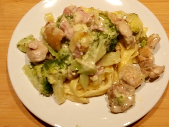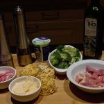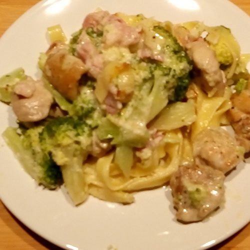 1. Zet alle ingrediënten klaar. Snijd de kippendijfilet in blokjes. Pel en snipper de knoflook. Rasp of schaaf de Parmezaanse kaas. Maak de broccoli schoon. Snijd het ontbijtspek in stukjes.