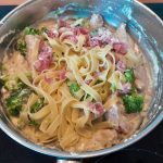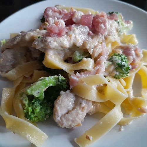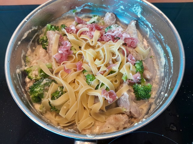 Doe de kip terug in de pan. Voeg ook de broccoli, pasta en de stukjes spek toe. Laat nog 1 minuutje doorwarmen en verdeel over de borden.