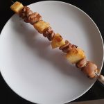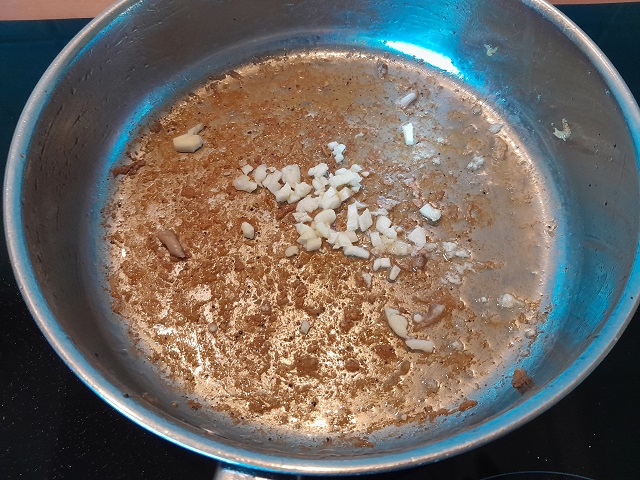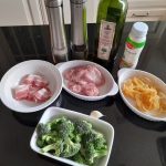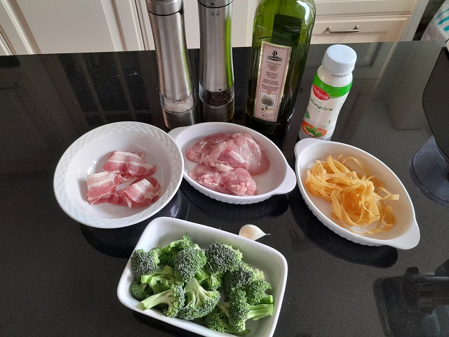 Zet alle ingrediënten klaar. Pel en snipper de knoflook. Snijd de kippendijfilet in stukjes. Snijd het spek in stukjes en bak dit in een droog koekenpannetje tot het krokant is.