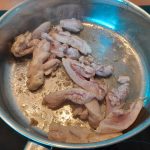 Voeg de kookroom toe en breng aan de kook. Schraap met een houten lepel de aanbaksels van de kip los van de bodem.