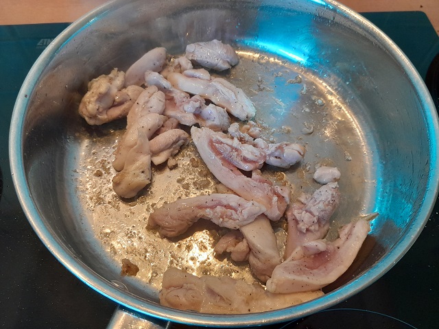 Verhit de olie in een hapjespan of koekenpan. Bak de kipblokjes rondom. Bestrooi met wat zout en peper. Haal de kip uit de pan en bewaar op een bordje onder aluminiumfolie.