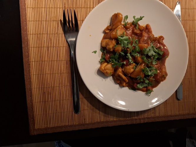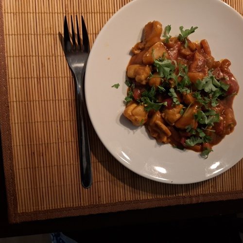 De goulash is klaar wanneer de aardappelen gaar zijn en de saus wat ingedikt is. Voeg dan de kip weer toe en roer de verse peterselie erdoor. Proef en breng op smaak met zout en peper.