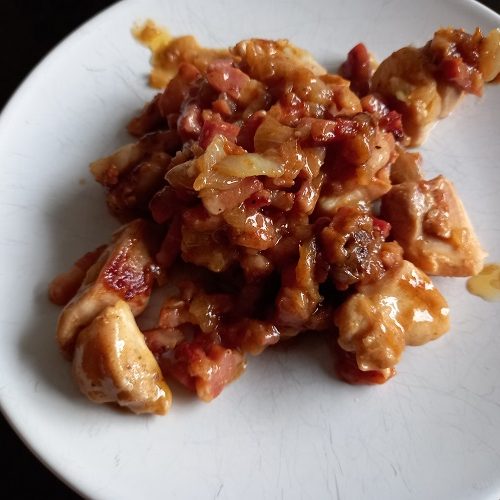 Zodra de kip mooi gekleurd is voeg dan de ui en de spekblokjes bij de kip. Voeg de kippenbouillon toe en laat het geheel een minuut of 10 zachtjes inkoken. Proef en breng eventueel nog verder op smaak met zout en/of peper.