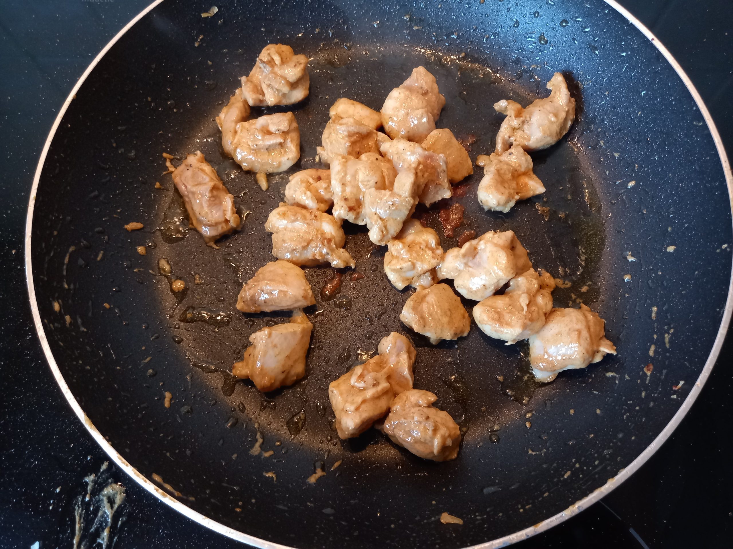 Verhit de olijfolie in de koeken pan en bak de kipblokjes.