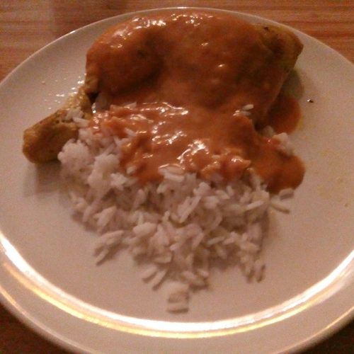 4. Verdeel de rijst over de borden. Leg er kippenbout naast en verdeel de saus over de kip en de rijst.