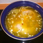 2. Doe in een braadpan de kip, tijm, ui, bleekselderij, laurier, de rode peper, de peperkorrels de koriander, kurkuma, kruidnagel, gember, knoflook en een beetje zout. Vul de pan met water zodat de kip net onder staat. Zet deze op en breng aan de kook. Zodra het water kookt, temper dan de warmtebron zodat het nog net zachtjes kookt. Laat ongeveer 1½ uur zachtjes koken met de deksel op de pan.