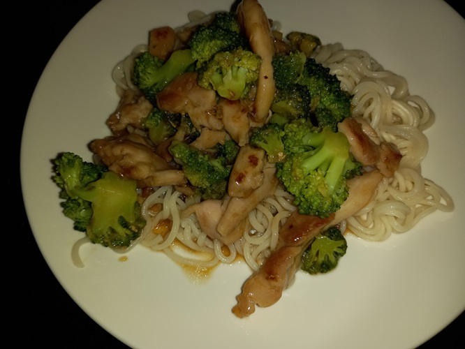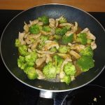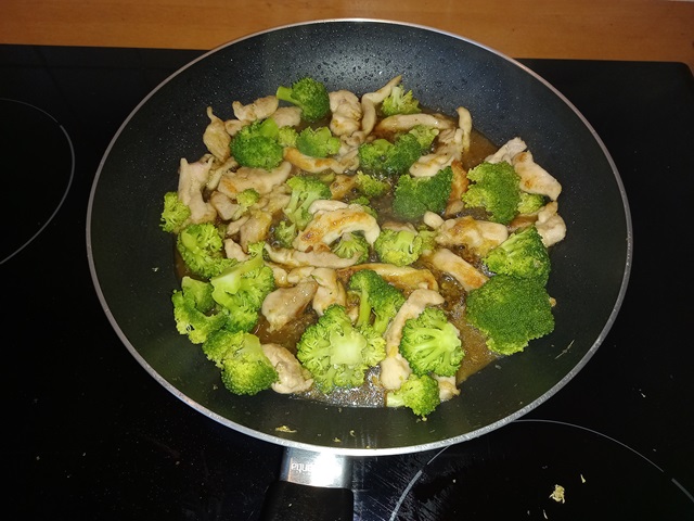Voeg de broccoli toe en bak deze een paar minuten mee. Roer de saus nog even door en voeg deze bij de broccoli met kip. Laat deze aan de kook komen en laat deze een minuut koken zodat deze wat indikt.