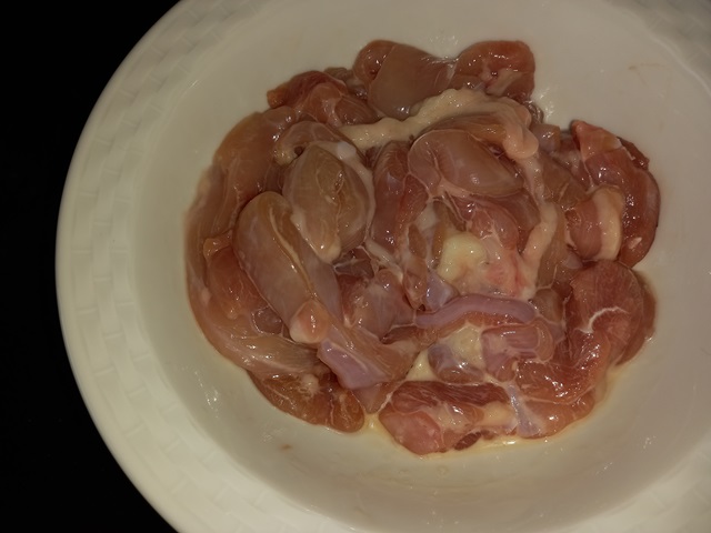 Doe de gesneden kip in een schaaltje. Meng in een kom alle ingrediënten voor de marinade. Schenk deze marinade over de kip en meng deze goed door elkaar. Laat de kip minimaal 10 minuten marineren.