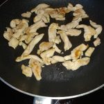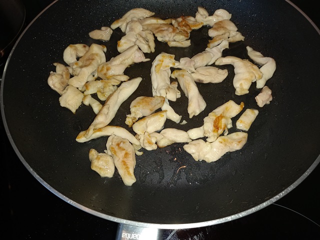 Verhit de olie in een koekenpan en bak de kip rondom aan. Voeg de knoflook en gember toe en bak deze en minuutje mee.