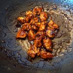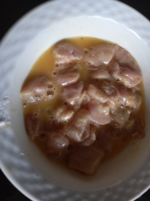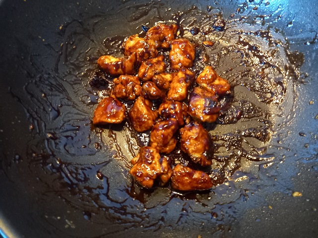 Bak de stukjes kip in de hete olie tot ze gaar zijn. Keer regelmatig om. Haal dan de kip uit de pan en bewaar onder aluminiumfolie.
