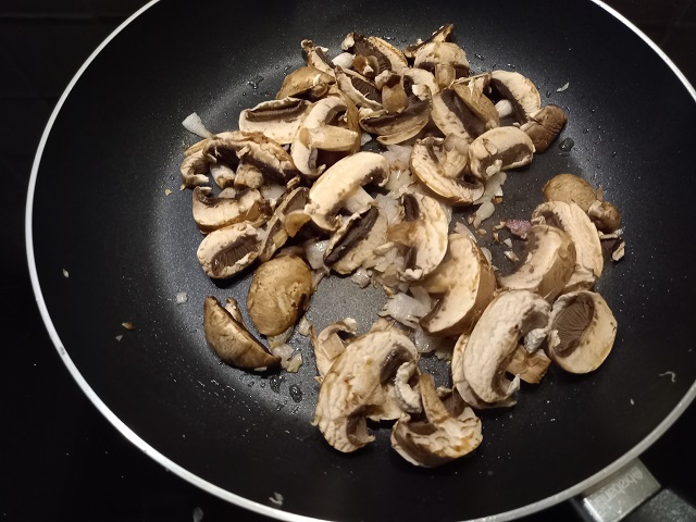 1. Verhit 1 el olijfolie in een koekenpan en fruit de sjalot gedurende een minuut of 3 zonder dat deze verkleurt. Doe er vervolgens de champignons bij en laat deze 2 minuten meebakken.