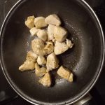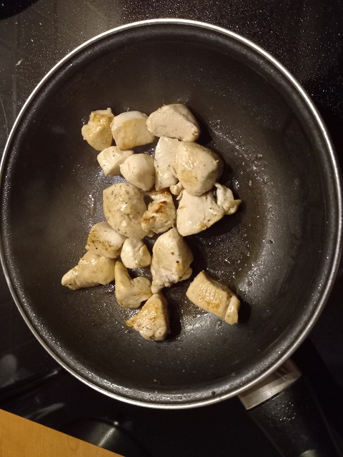 3. Verhit ondertussen in een andere koekenpan 1 el. olijfolie en bak de kipblokjes aan alle kanten bruin.