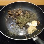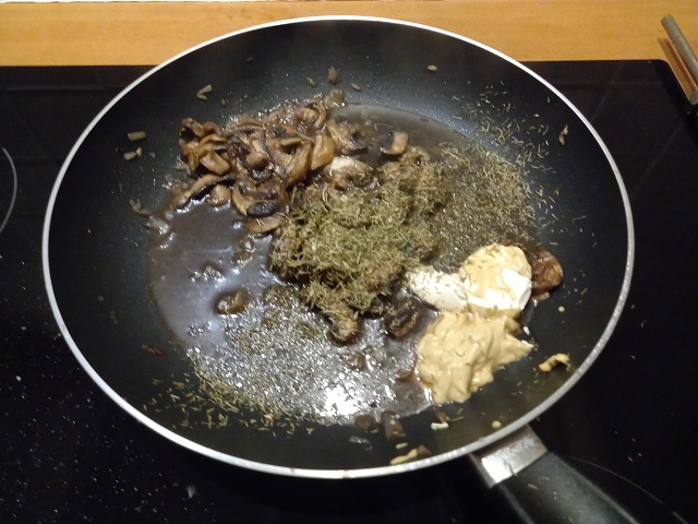 4. Voeg aan de pan met de champignons de mosterd, crème fraîche en de dragon toe. Roer alles goed door elkaar.