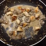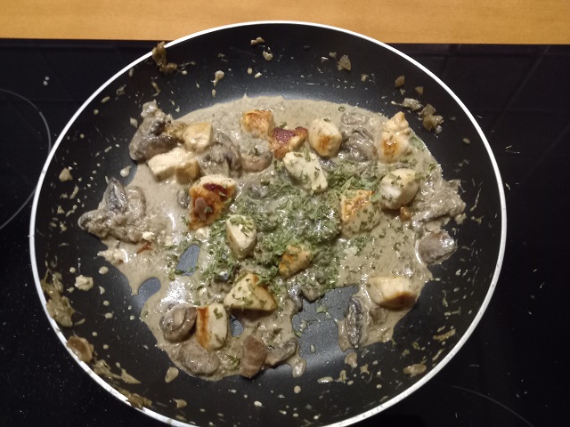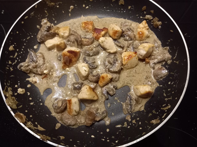 5. Voeg de gebakken kip toe aan de pan met de champignons.