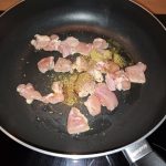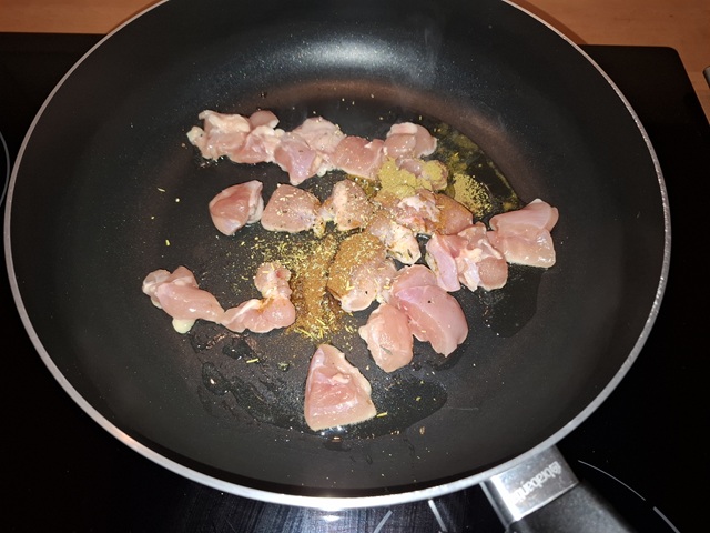 Verhit de olie op middelhoog vuur en bak de kipstukjes rondom aan. Voeg een beetje zout en peper toe. Haal de kip uit de pan en bewaar onder aluminiumfolie.