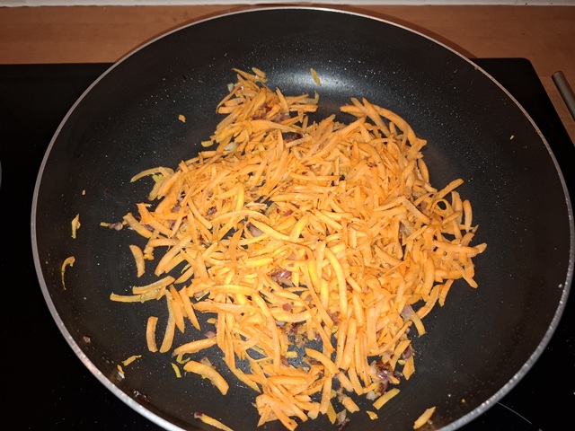 Voeg de wortels en de knoflook toe. Breng op smaak met zout, peper, paprika, komijn en de provençaalse kruiden. Kook de groenten 5-7 minuten totdat ze zacht zijn.