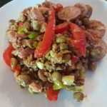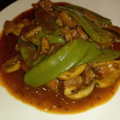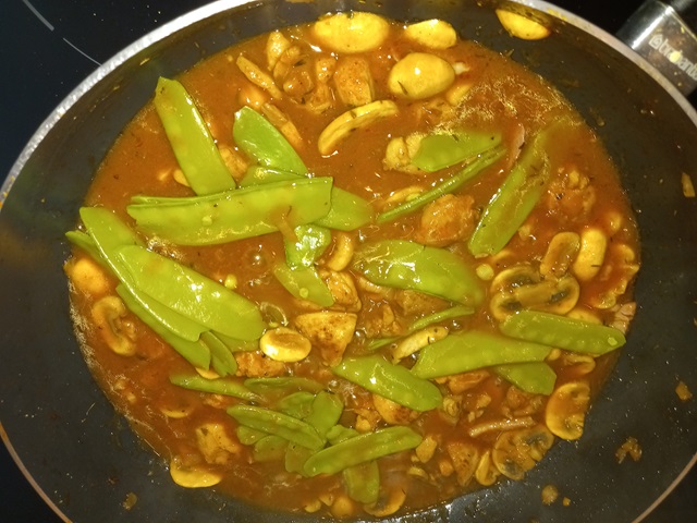 Voeg de peulen toe en warm nog even door. Verdeel over de borden en serveer.