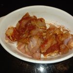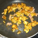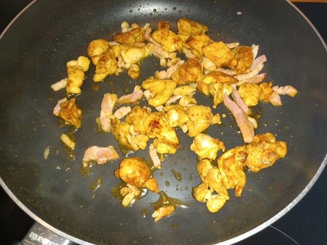 Zodra de kip rondom is aangebakken voeg dan de spekreepjes toe.
