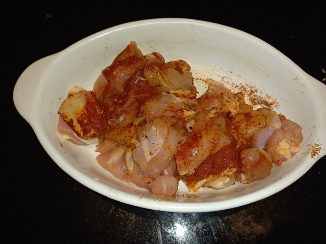 Bestrooi de blokjes kippendij met het paprikapoeder en wat zout en peper. Meng goed door elkaar.