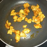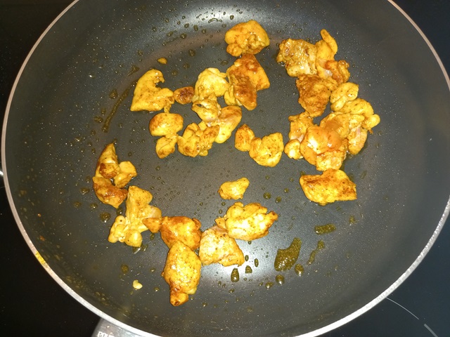 Verhit in een koekenpan 1 el. olie. Voeg de kipblokjes toe en bak rondom aan.