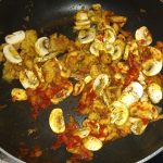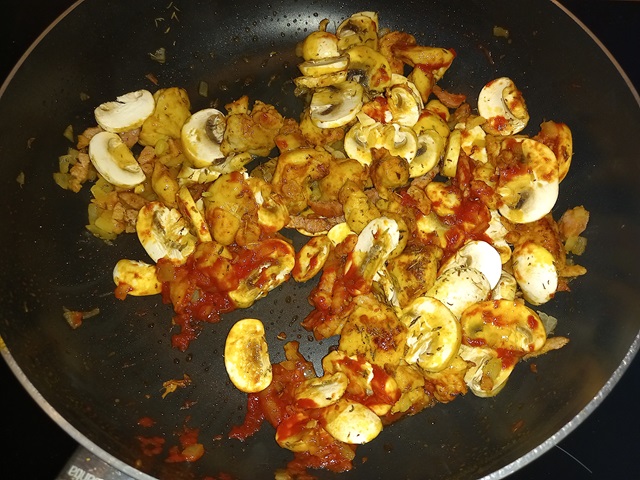 Temper de warmte bon een beetje en voeg de ui toe. zodra deze glazig is voeg dan de knoflook toe en laat een half minuutje meebakken. Voeg de champignons, tijm, tomatenpuree en het bouillonpoeder toe en bak dit een minuut mee zodat de tomatenpuree kan ontzuren.