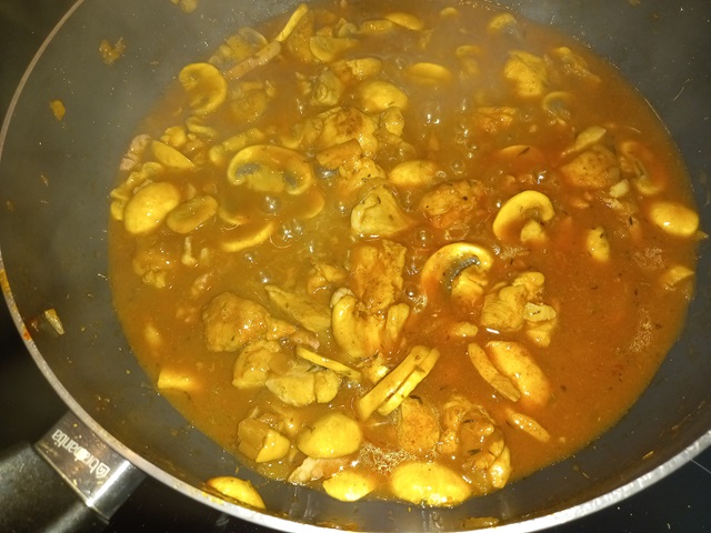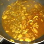 Blus af met de wijn. Laat een paar minuten zachtjes koken zodat de alcohol kan verdampen. Voeg 200 ml. water toe met de suiker. Breng aan de kook en laat zachtjes pruttelen. Maak een papje van de maïzena en een scheutje water. Voeg dit al roerend met een garde toe aan het gerecht en blijf zachtjes roeren tot de saus gaat binden.