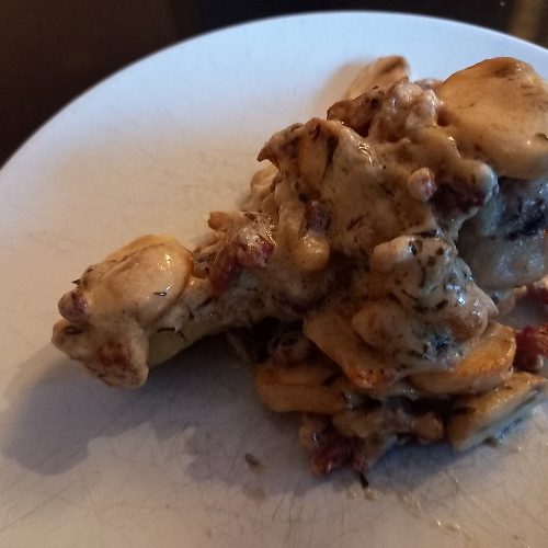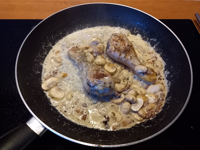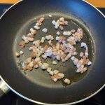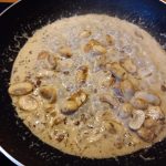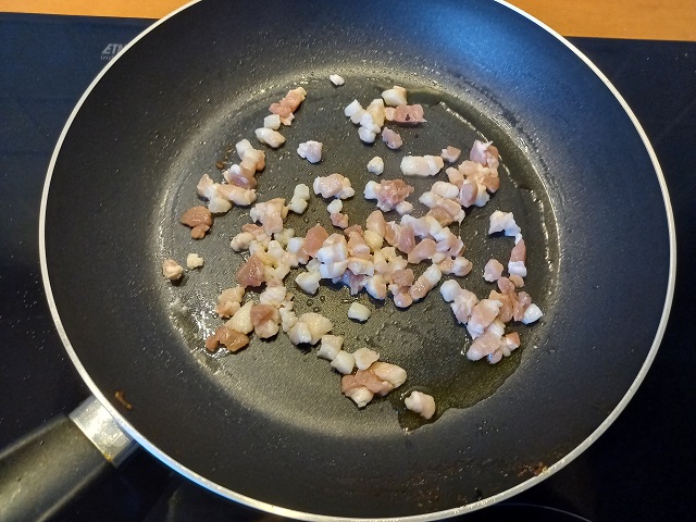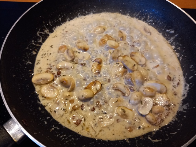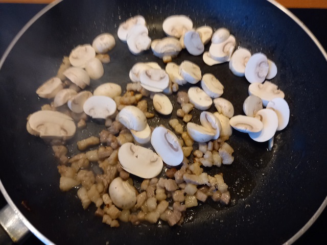 Maak ondertussen de champignonsaus. Bak de spekjes in dezelfde koekenpan tot ze bijna krokant zijn.